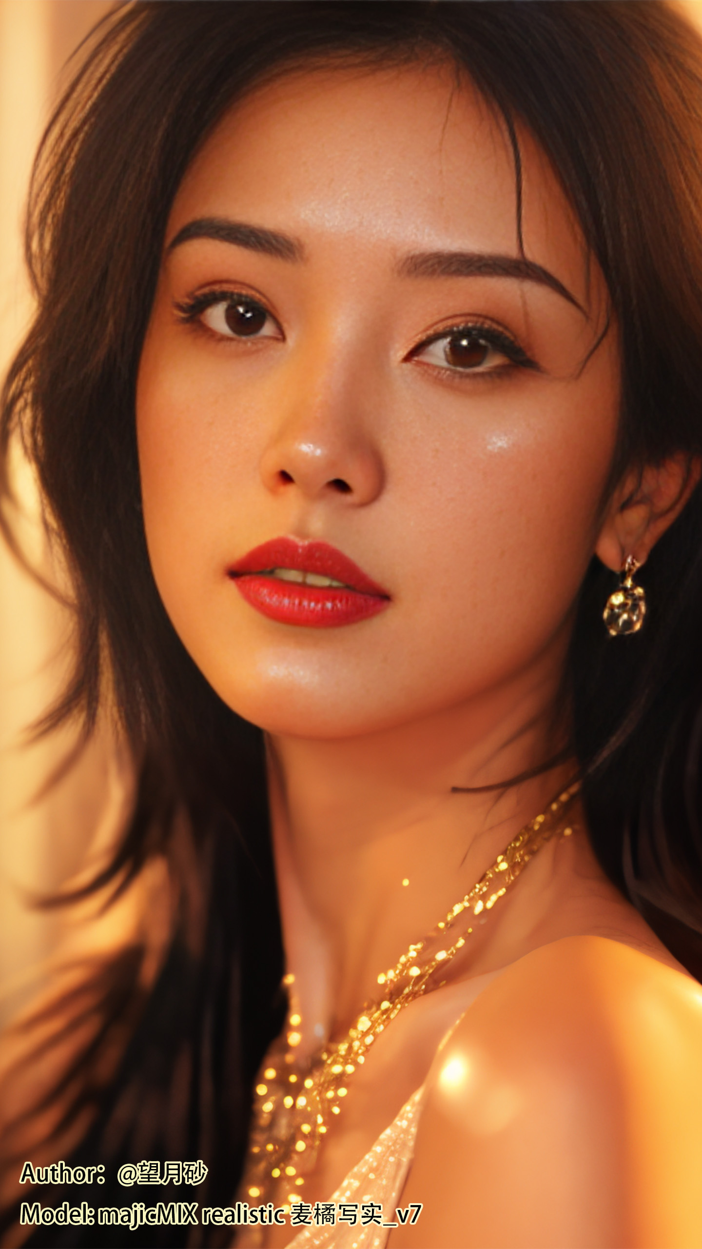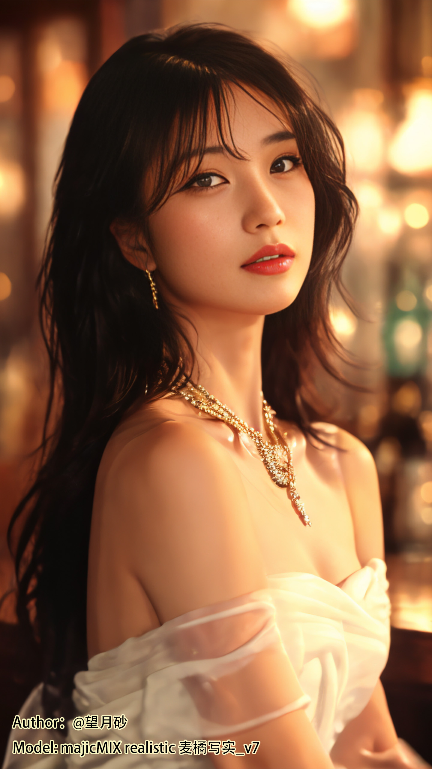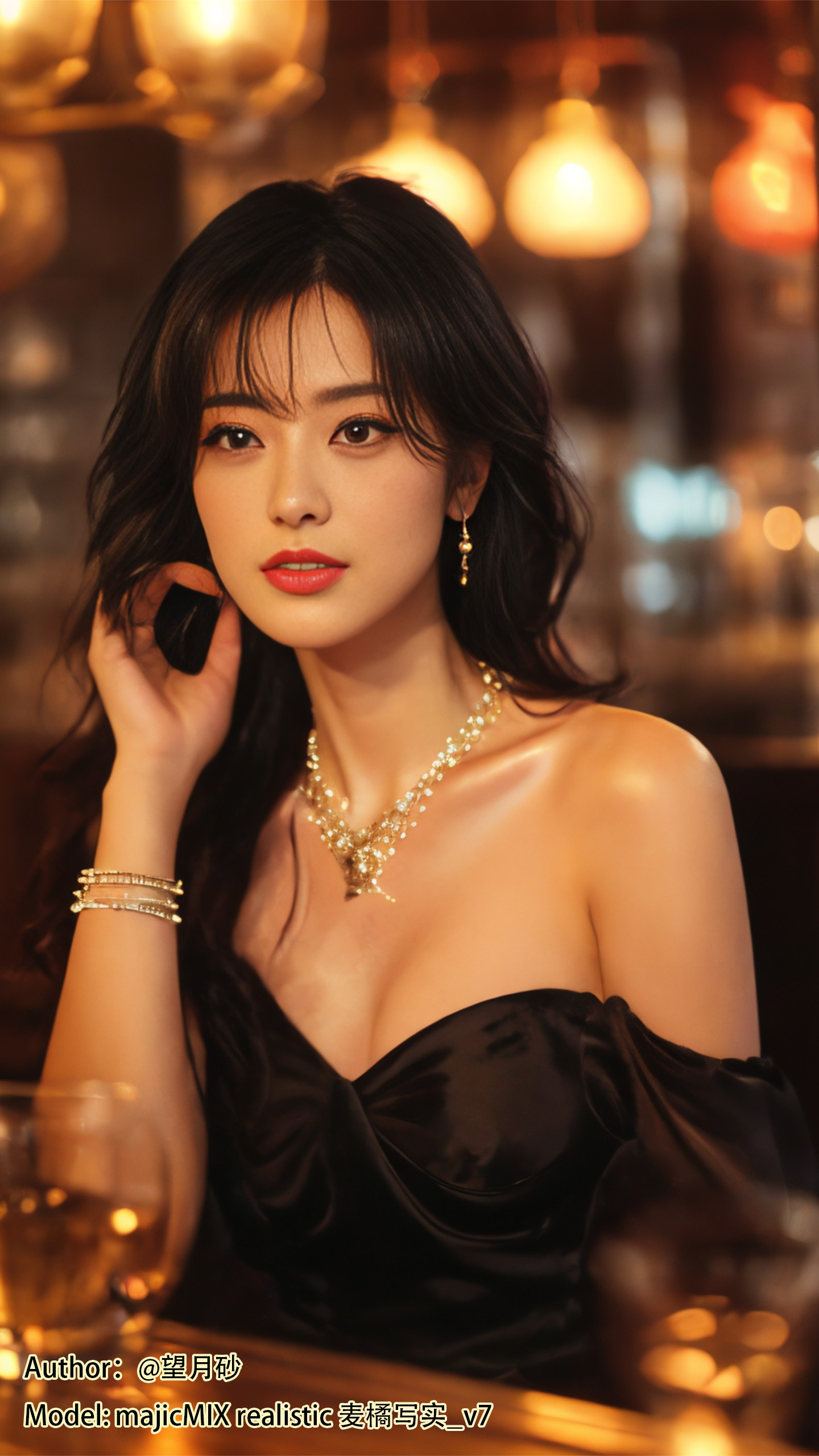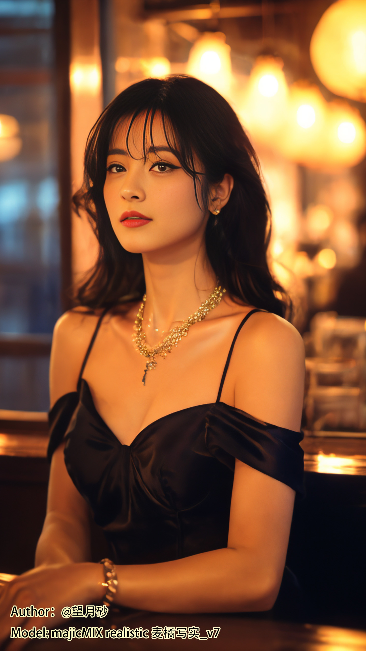 Canon RF85mm f/1.2,masterpiece,best quality,ultra highres,1 girl,solo,slender face,sweet,shyness,white_shiny_skin,black eyes,necklace,brown_long_wavy_hair,eyelashes,bangs,make-up,shiny,Pore,skin texture,bracelet,offshoulder,see-through,evening gown,bar background,<lora:繁花LORA-90年代场景_1.0:0.7>,<lora:girl_SDLife_Chiasedamme_v2.3:0.6>