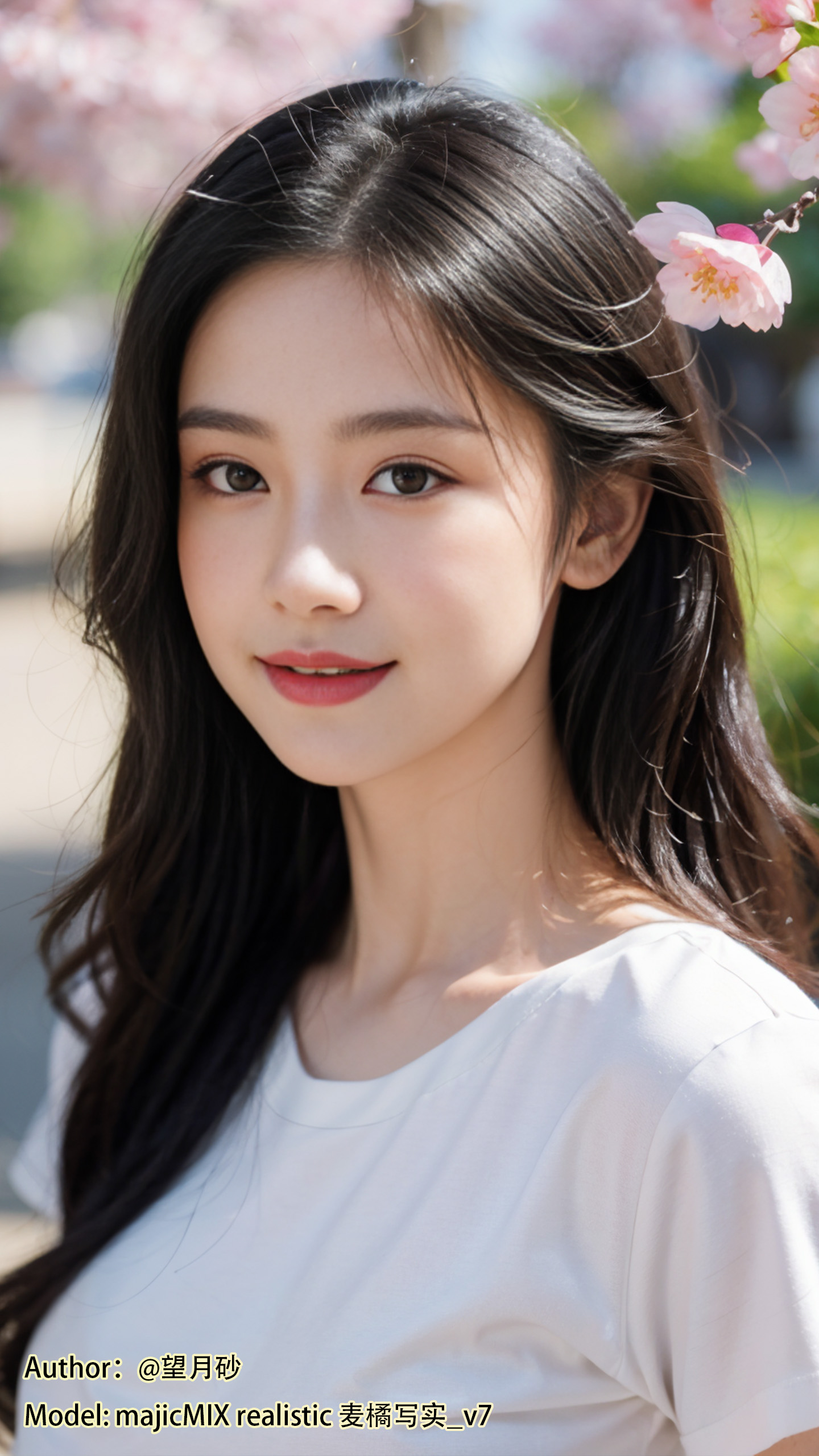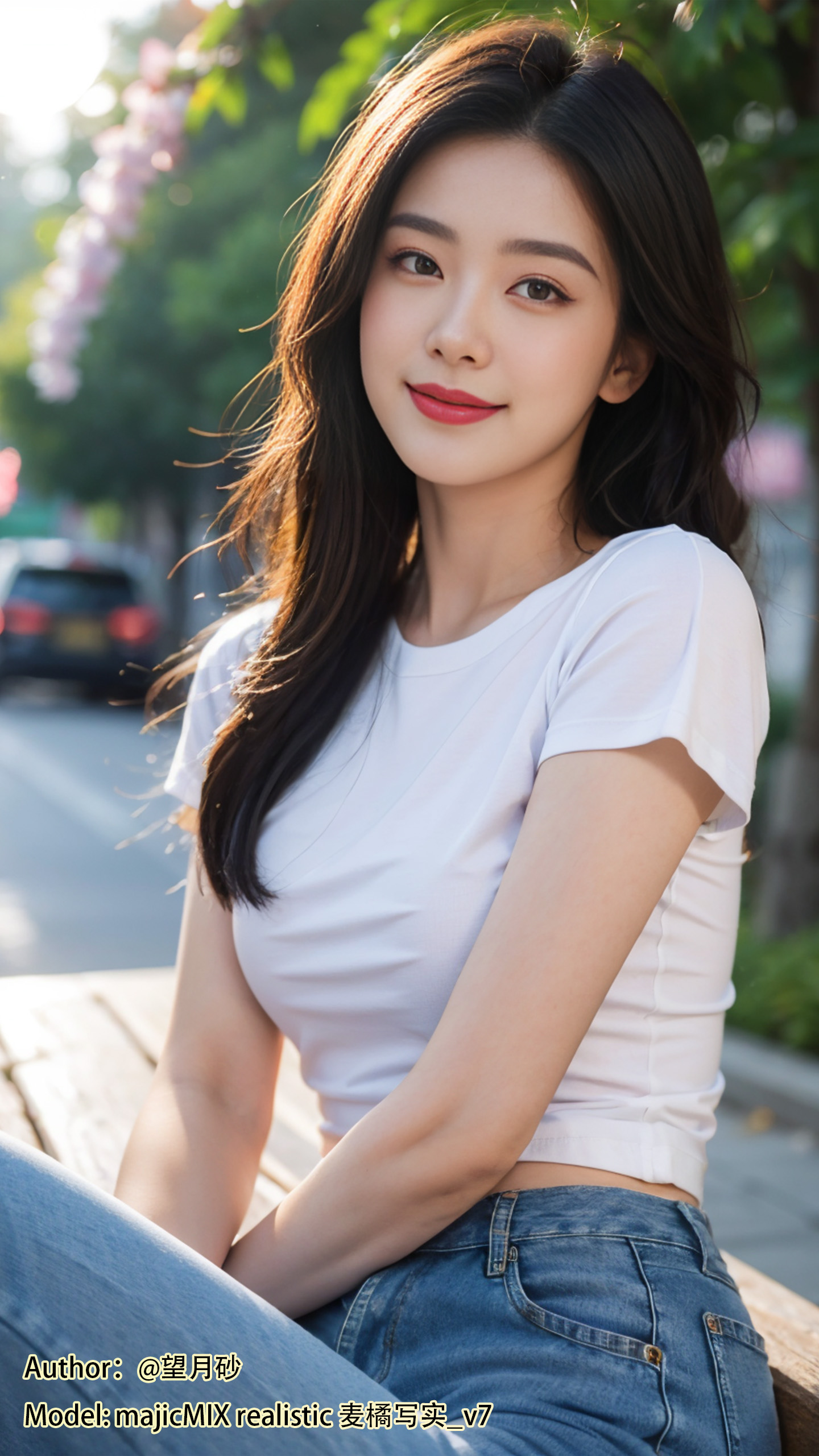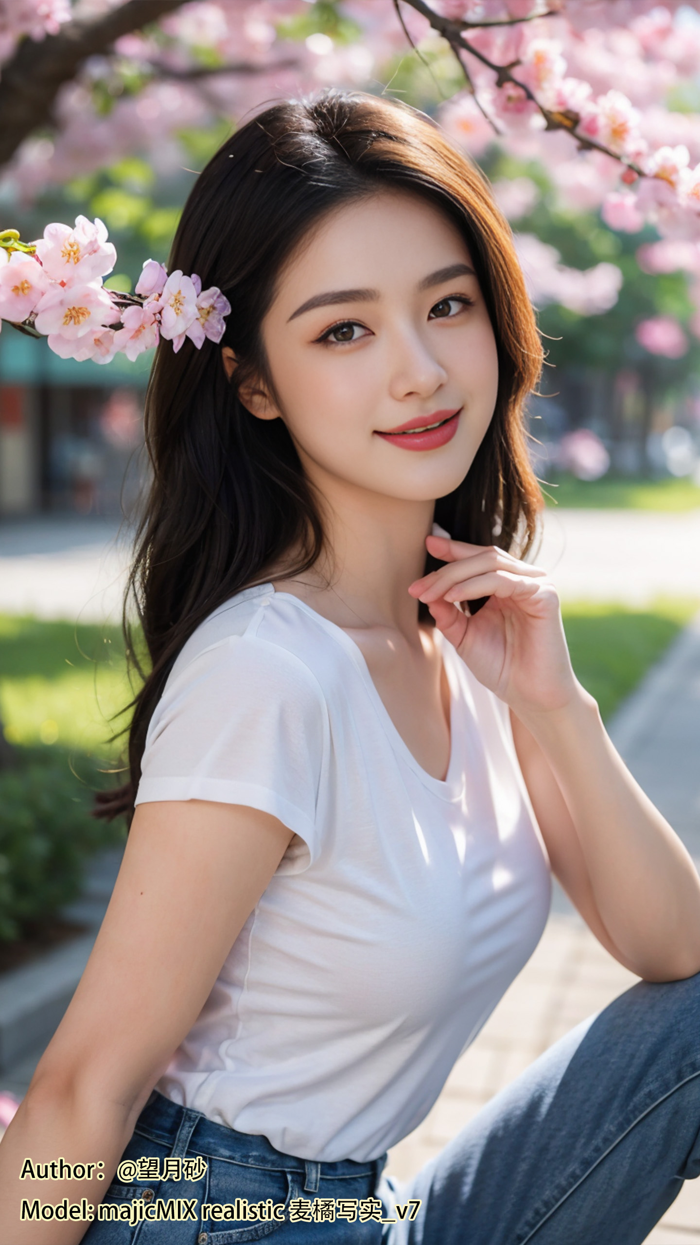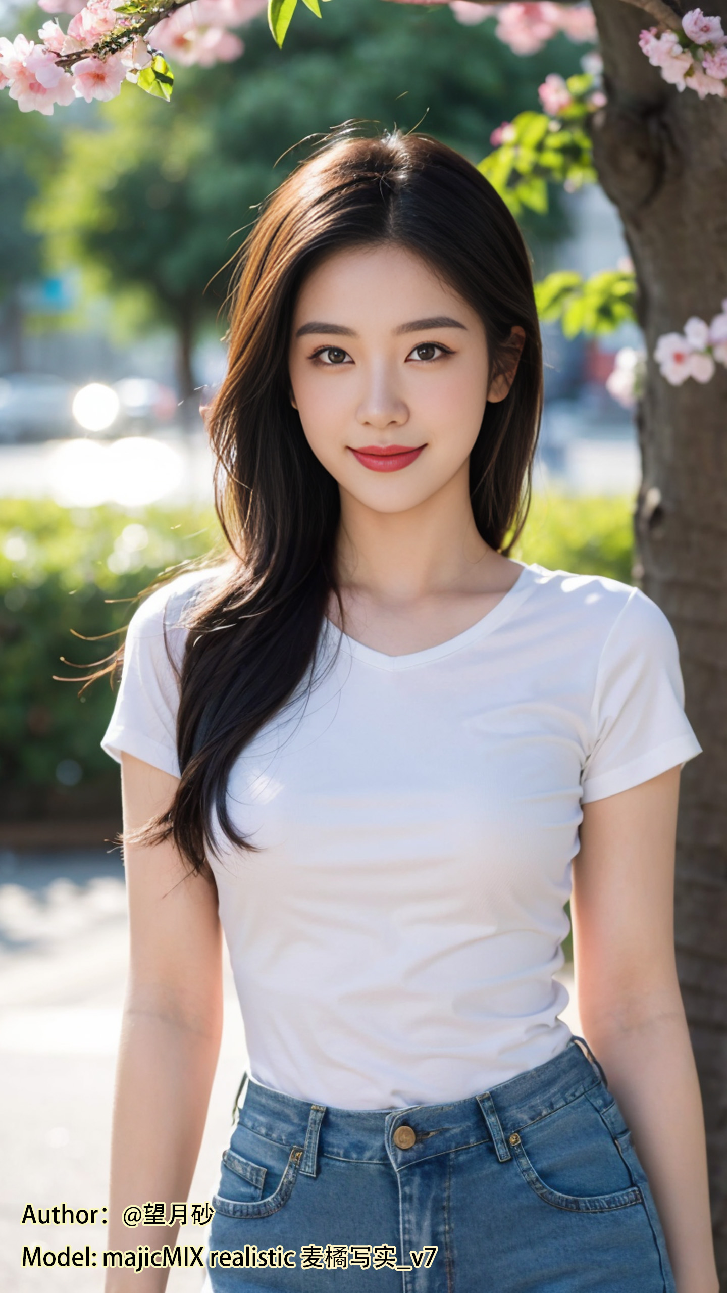 Masterpiece,Realistic,best quality,4k,fashion photography of 1 girl(23-y-o),beauty,more facial features,smile,half body,look_at_viewer,white t-shirt,jeans,love,<lora:girl_SDLife_Chiasedamme_v2.3:0.6>,sun glare,(depth of field:1),light particles,plum blossom,<lora:YFilter_BeautyFace_CN_V1:0.2>,available light,colorful,