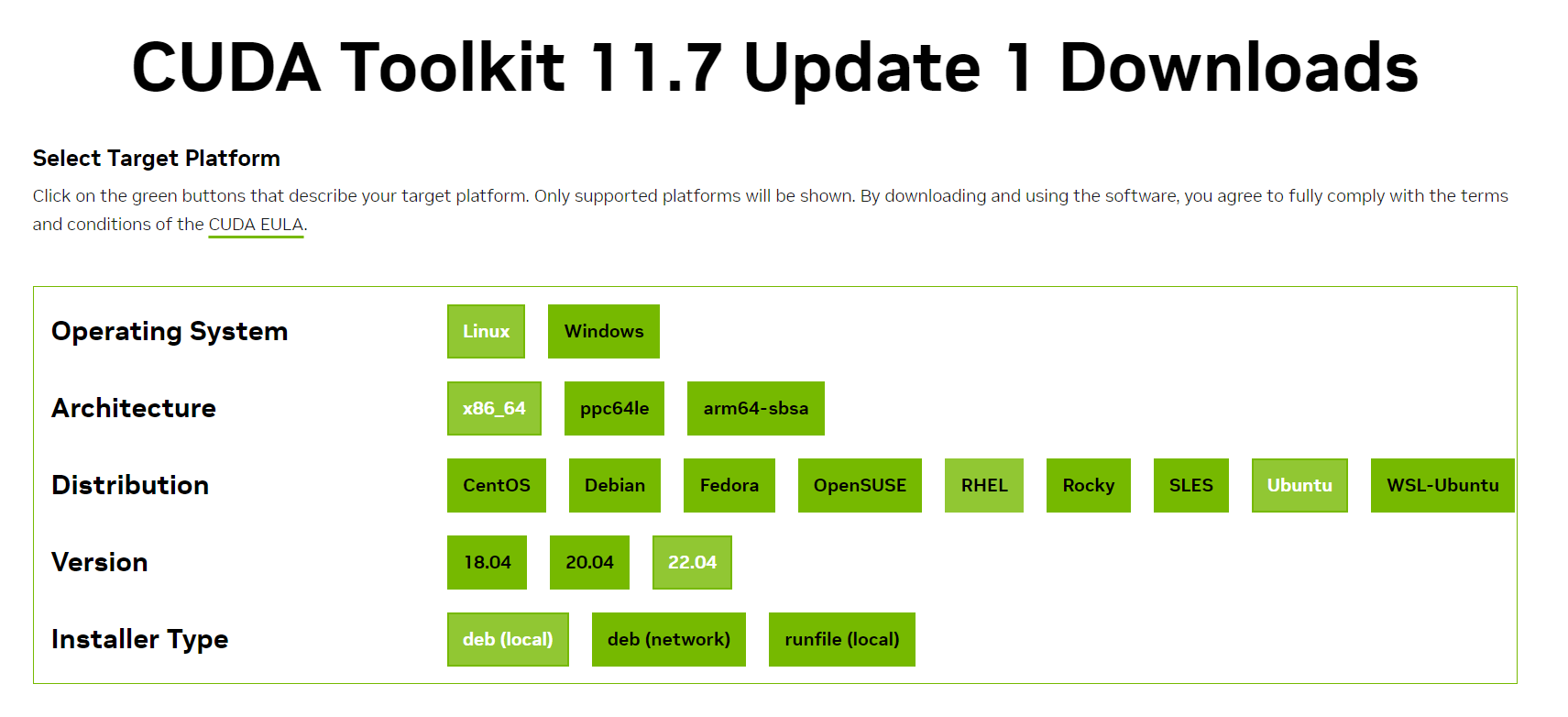 前往官网安装页面CUDA Toolkit 11.7 Update 1 Downloads | NVIDIA Developer,选择自己的操作系统和版本。