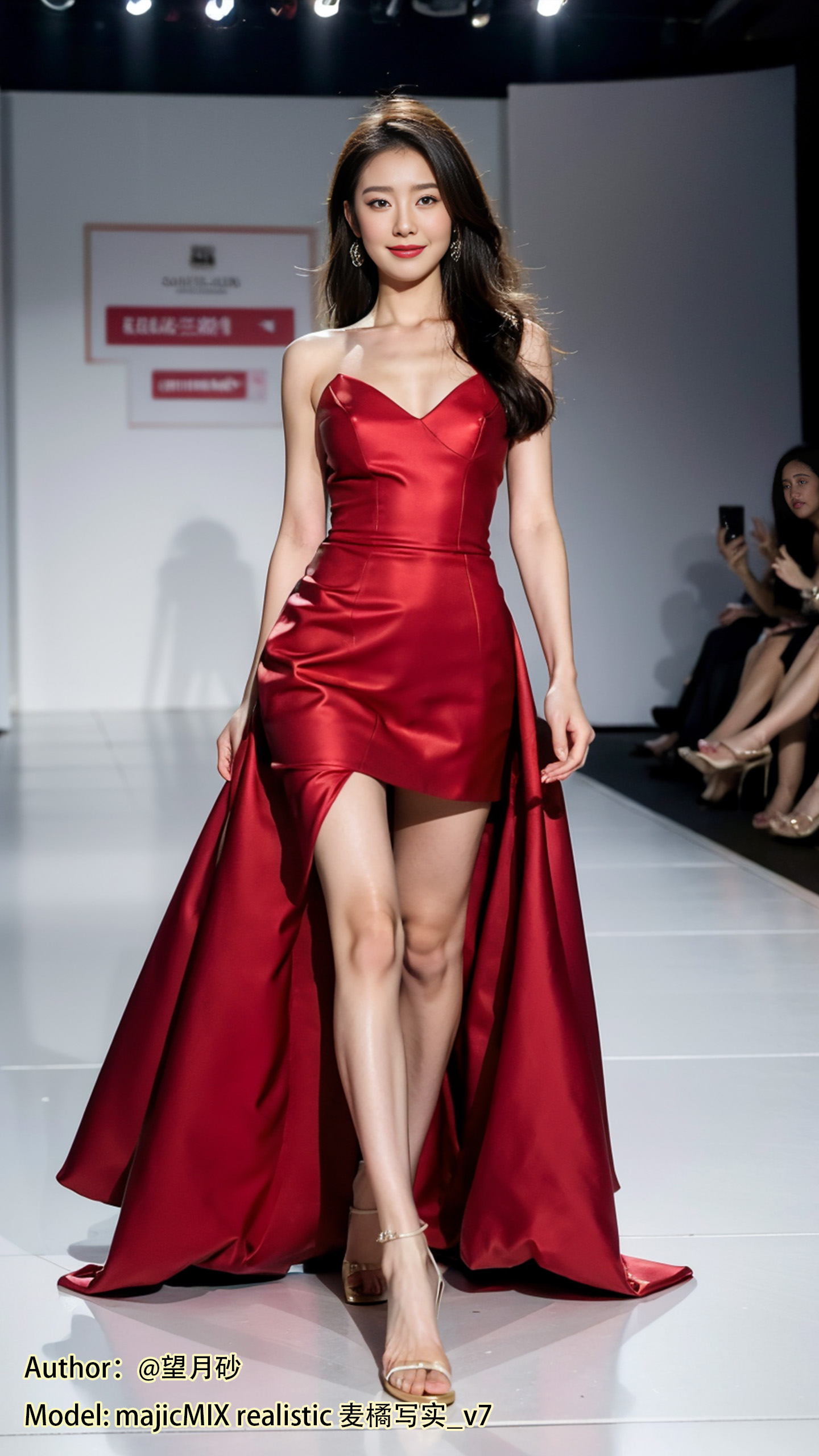 girlvn01,1girl,smile,Stunningly Beautiful Girl,Haute_Couture,designer dress,wearing Haute_Couture,posing for a picture,fashion show,Long shaped face,dark red eyes,Sandy Blonde side-swept hair,long hair,long ringlets,long legs,catwalk \(walkway\),colorful,vivid colors,masterpiece,best quality,absurdres,highest quality,amazing details,8k,aesthetic,<lora:YFilter_BeautyFace_CN_V1:0.7>,<lora:girl_SDLife_Chiasedamme_v2.3:0.6>,<lora:ML_20230602144235:0.6>,