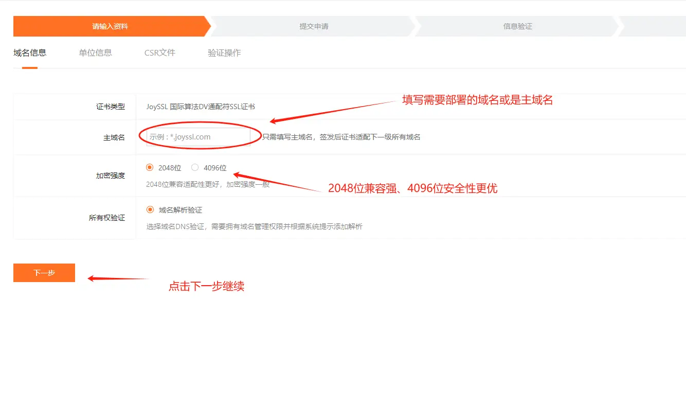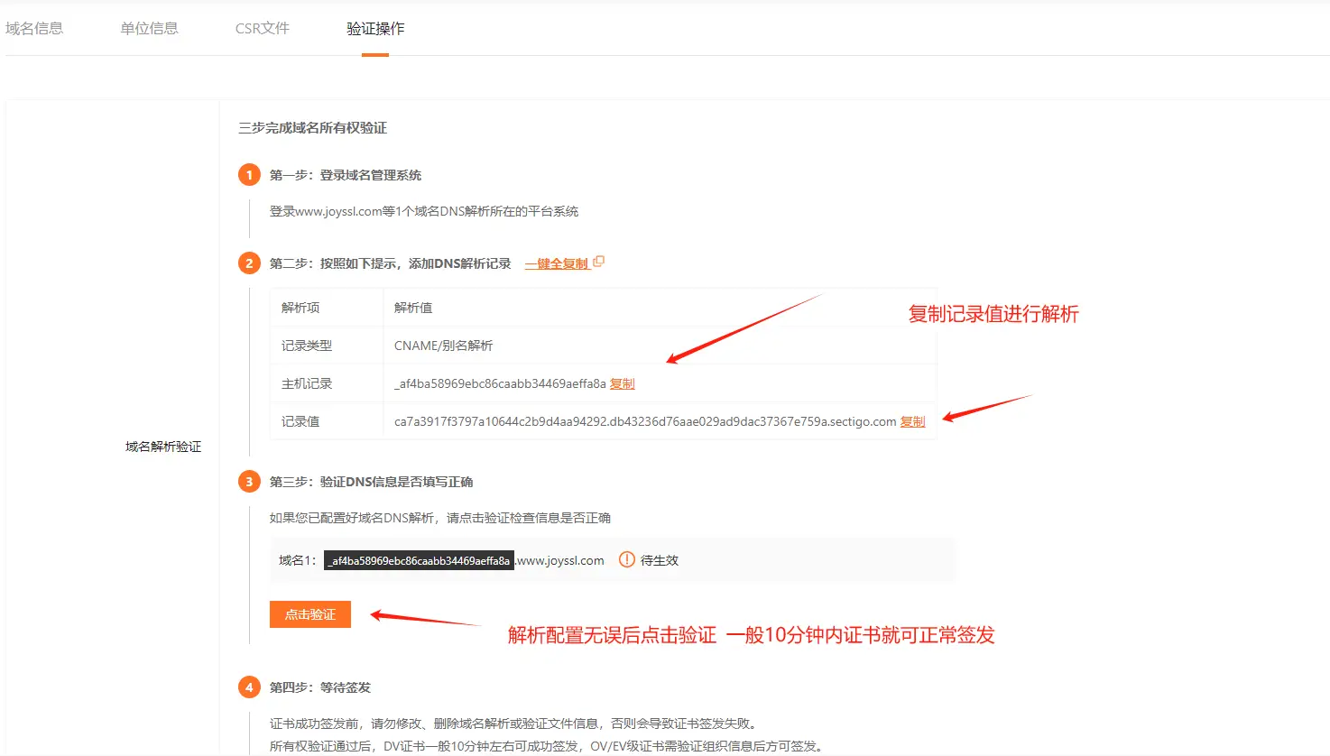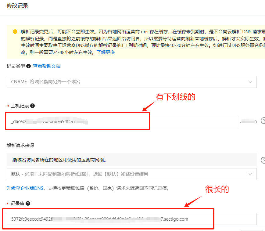 验证域名所有权,别写错了,申请成别人家的域名了。方法是修改域名的解析,将主机记录(有下划线的),设置为自己的子域名,这个域名指向“记录值”(很长的)。