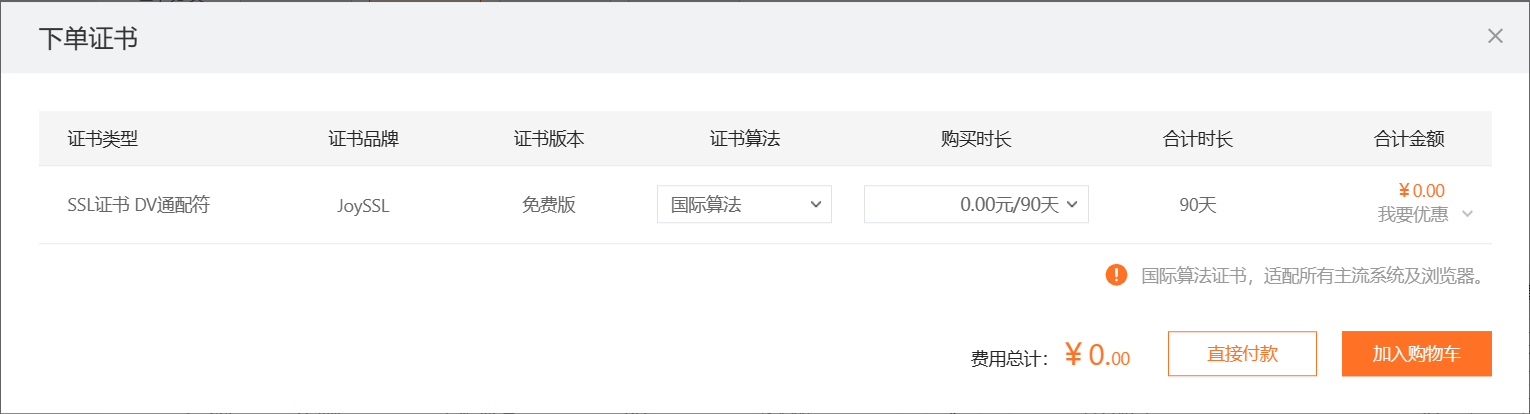 左侧导航选择【购买正式】,点击筛选条件,我选择的免费SSL证书,通配符,也就是可以通过*匹配很多子域名。品牌是JoySSL,目前这个是绝对免费的,不过有效期3个月。当然,三个月后还可以续订,就是有点麻烦,不过免费,麻烦就麻烦了。