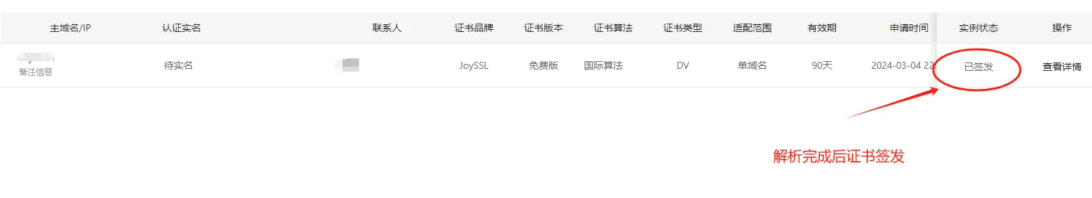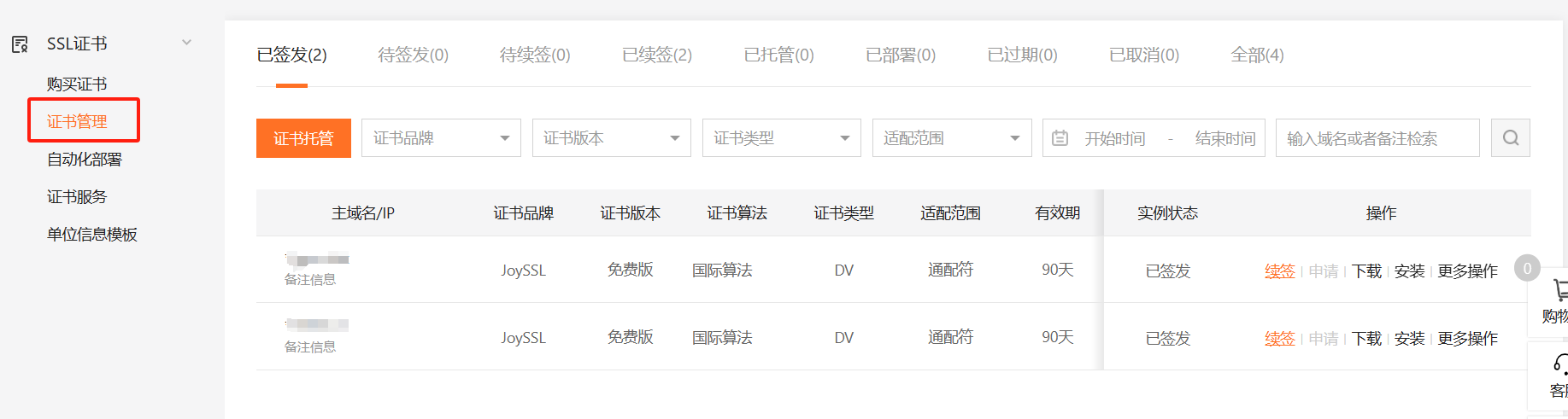 购买成功后,在证书管理中看到自己的证书了。然后点击【操作】-【申请】请求获得这个证书。